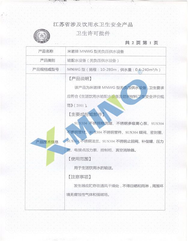 衛(wèi)生許可批件--無負(fù)壓供水